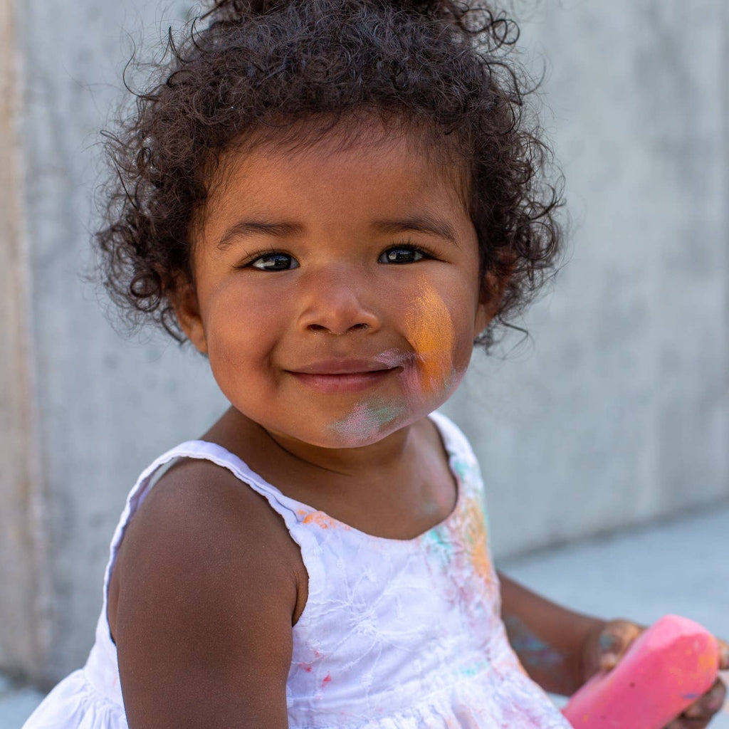 Designer set of 5 uniquely-oversized sidewalk chalk. Perfect for chunky toddler fingers and for older kids to transform any city surface into a work of art. Our color palettes are more vibrant than standard chalk tones. A great giftshop and retail staple. Our chalk is intentionally chunky for little chunky fingers - each chalk stick is 1 3/8" wide x 4" tall. Produced with eco-friendly, non-toxic dyes.