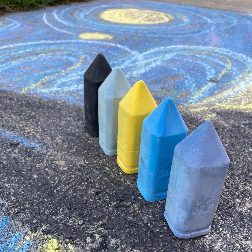 Designer set of 5 uniquely-oversized sidewalk chalk. Perfect for chunky toddler fingers and for older kids to transform any city surface into a work of art. Our color palettes are more vibrant than standard chalk tones. A great giftshop and retail staple. Our chalk is intentionally chunky for little chunky fingers - each chalk stick is 1 3/8" wide x 4" tall. Produced with eco-friendly, non-toxic dyes.