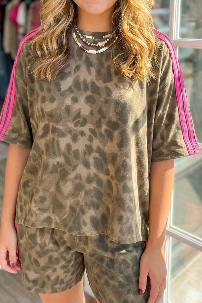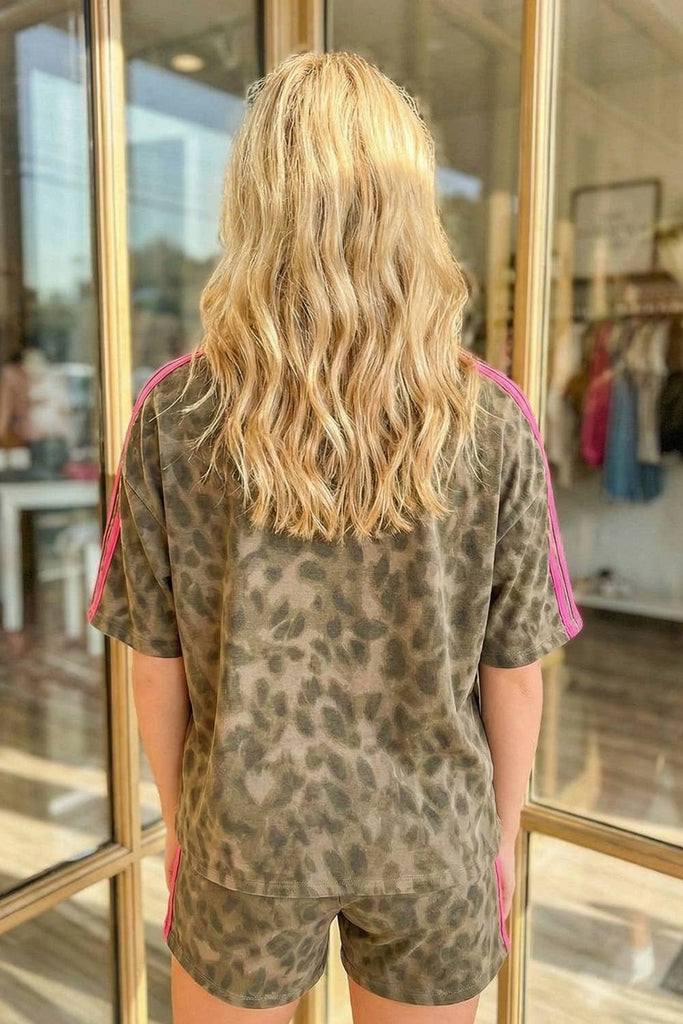 LAS Contrast Striped Accent Leopard Short Set