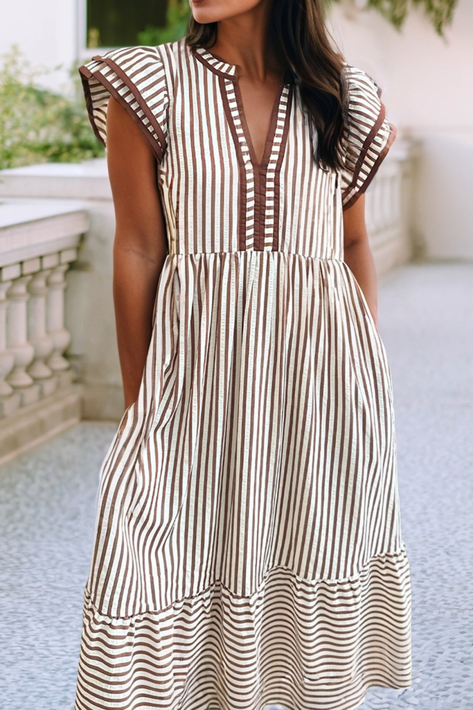 LDC Spring 2026 Ruffled Stripe Contrast Trim V Neck Dress: Brown Stripe