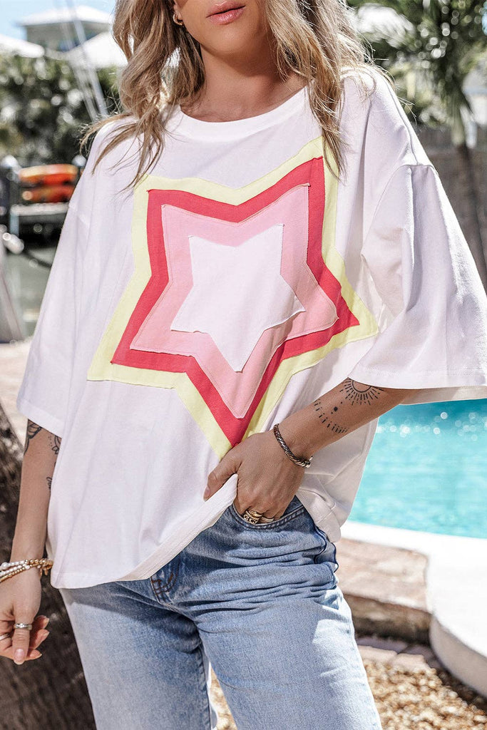 Colorblock Star Patched Half Sleeve Oversized Tee pink